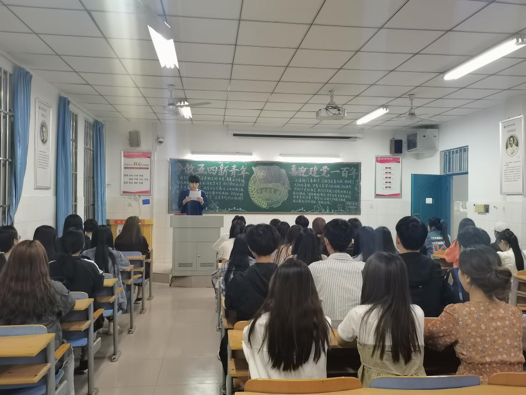 为弘扬五四精神,宣传党史教育,引导广大青年以良好的精神面貌献礼建党100周年和五四运动102周年,工商管理学院于4月29日晚开展以“争做五四新青年,喜迎建党一百年”为主题的团课,参加此次团课的班级有20工程01、20工程02、20工商01、20工商02、20国商02。